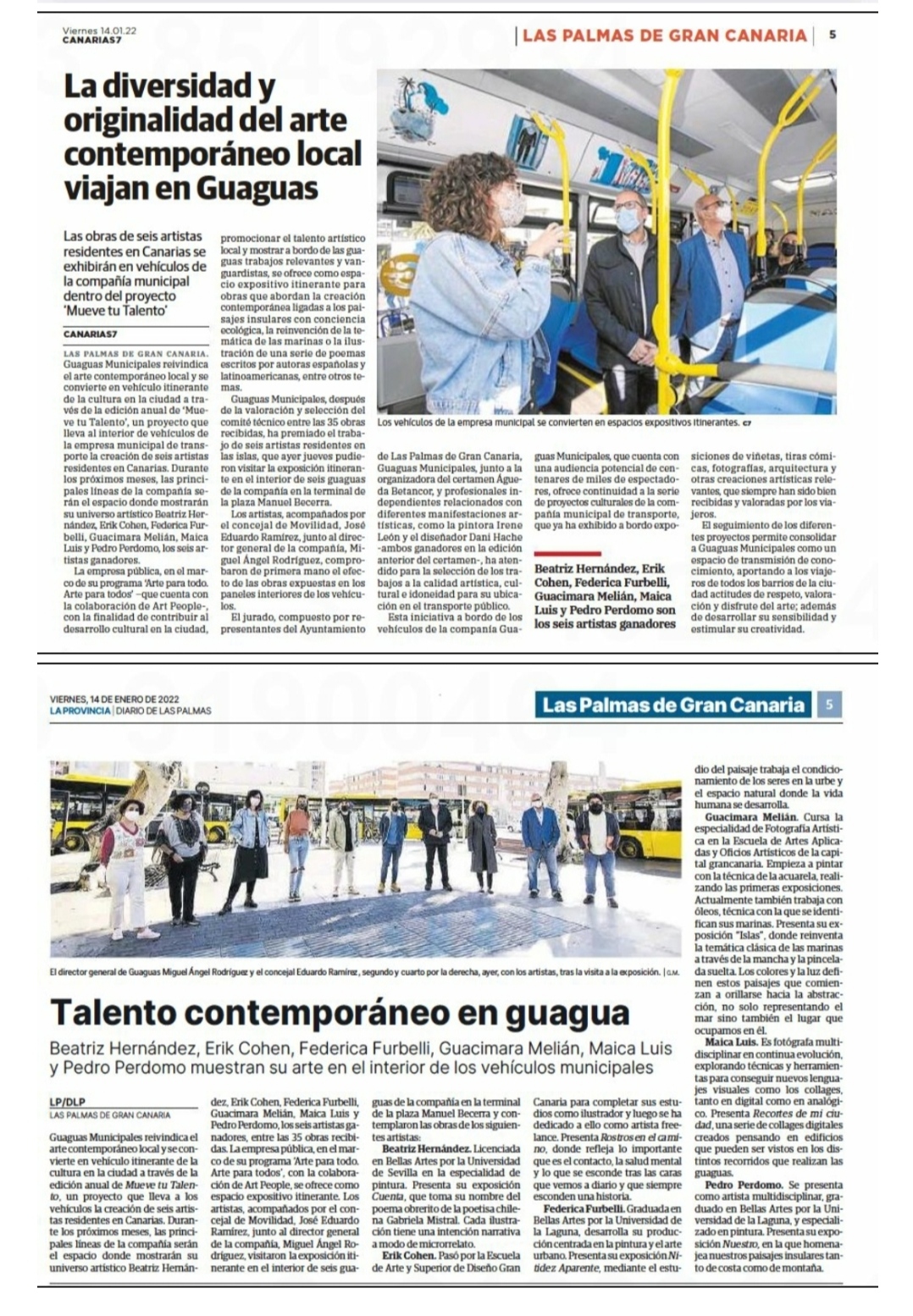 "Mueve Tu Talento" es una iniciativa de Guaguas Municipales de Las Palmas de Gran Canaria para exponer obras artísticas originales en formato digital dentro de las guaguas que se mueven por la capital. Así se acerca el arte a los usuarios del transporte público. En el año 2021 fui elegida y mis pinturas recorrieron la ciudad.